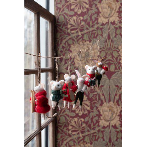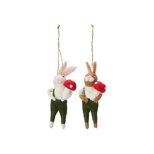 Tovede juledekorasjoner i ull av kaniner som holder en sopp. Velg mellom den hvite og den brune, eller la de henge sammen som to myke venner!