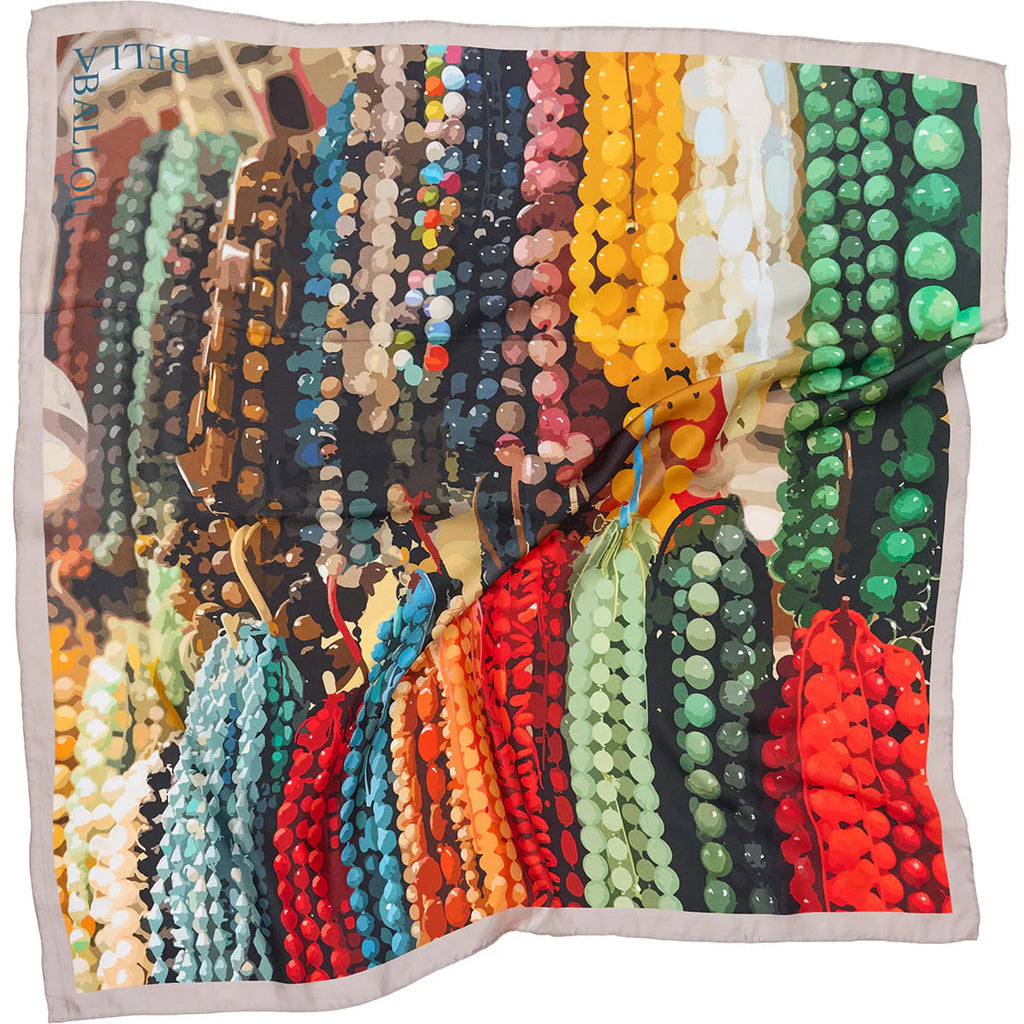 Beads-skjerfet er et kvadratisk silkeskjerf, hvor et fotografisk øyeblikk forvandles til et kunstnerisk uttrykk. Motivet tar utgangspunkt i et foto tatt i Hongkong av halvedelsteiner tredd på snor, innfanget i et urbant øyeblikk – og siden bearbeidet i Photoshop for å fremheve formenes rytme og fargenes dybde.