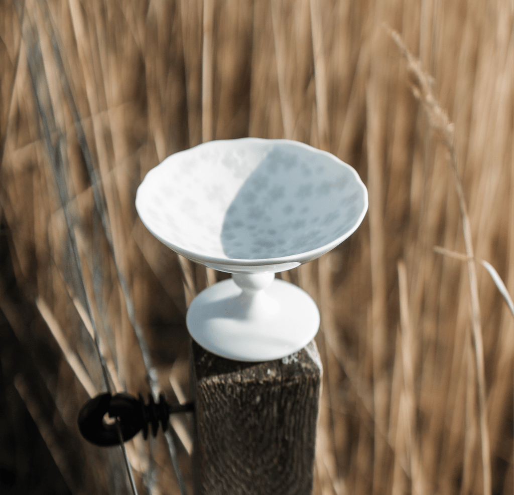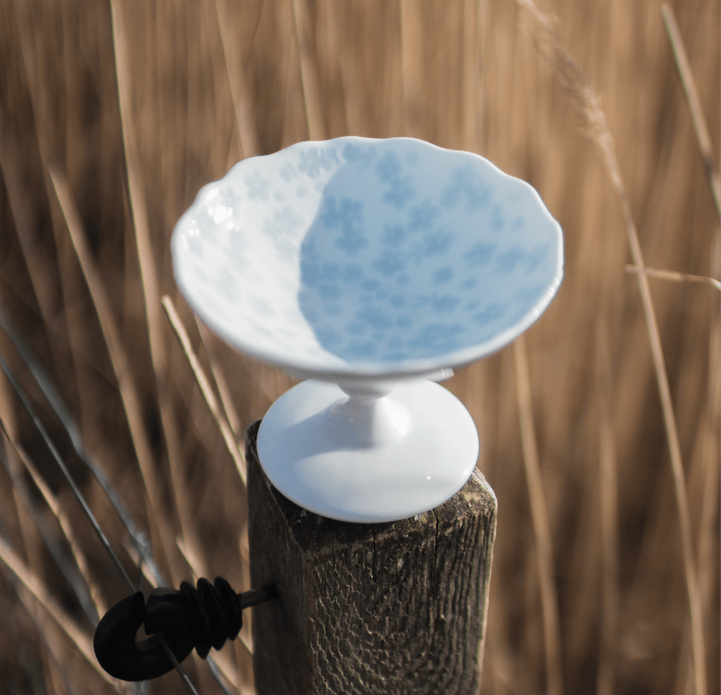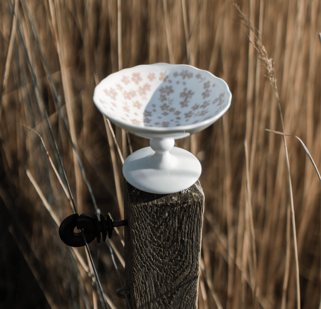 Bolle i benporselen med stett fra Slåpeblom. Slåpeblom er et symbol for det som går i arv og er formgitt av Wik & Walsøes grunnlegger, Linda Svedal Walsøe, i samarbeid med datteren Ylva Svedal Jørundland for hverdagene nå, og de hverdagene som kommer etter oss.
