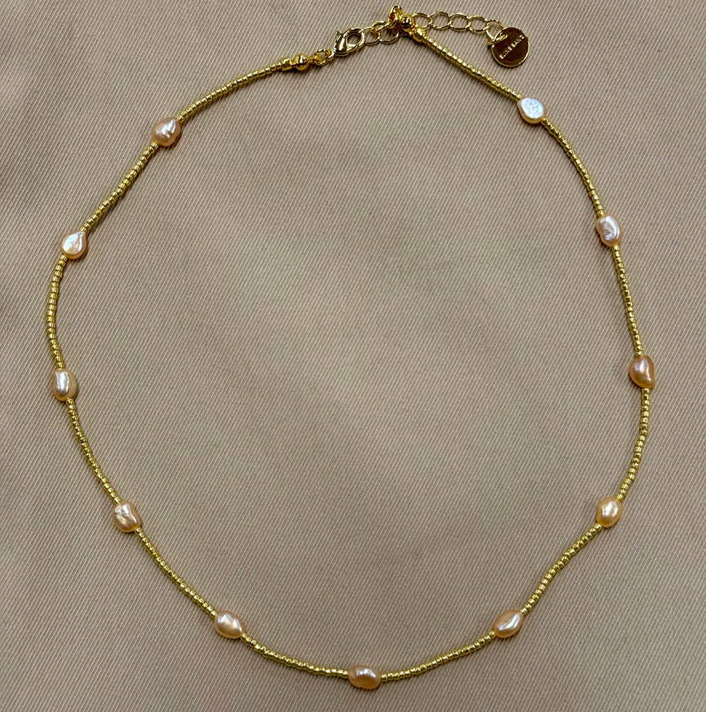 Dette nydelige smykket er laget med ferskvannsperler, glassperler og 18k gullbelagt messing med e-coating. Den justerbare størrelsen gjør at det passer komfortabelt rundt halsen fra 40-43 cm. Det er virkelig det perfekte tilbehøret for å løfte ethvert antrekk. Hvert smykke kommer i en smykkepose sammen med et feel good-kort, og er klar til å bli gitt bort.