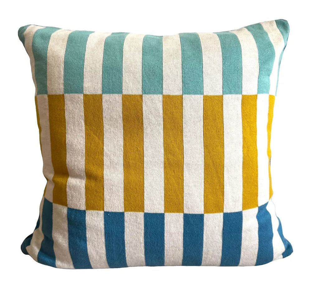 Jacquardstrikket pute i myk Øko-Tex-sertifisert bomull. Lekent og fargerikt mønster i geometriske former.