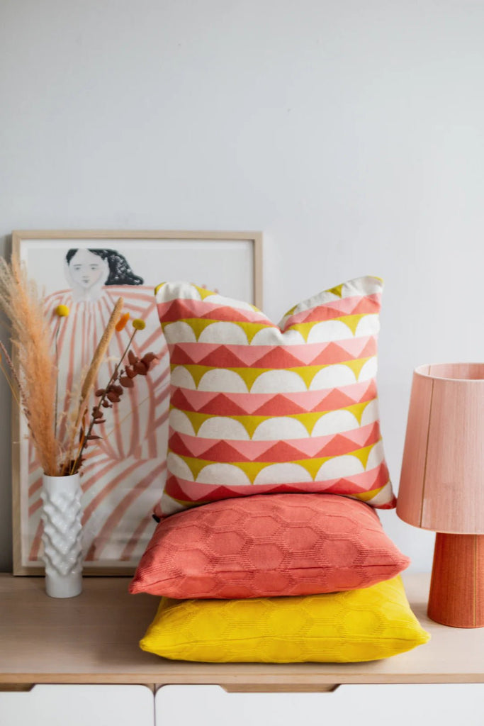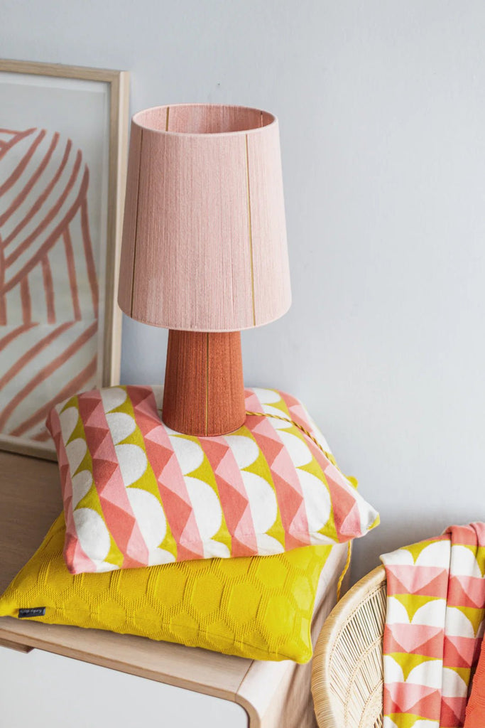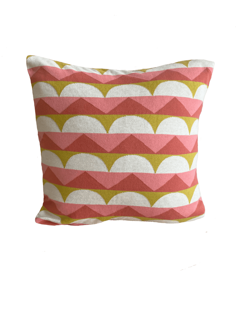 Jacquardstrikket pute i deilig bomullskvalitet. Designet er inspirert av skandinaviske designtradisjoner, med fokus på rene linjer og lekne grafiske former, med et nikk til 60-tallets unike formspråk.
