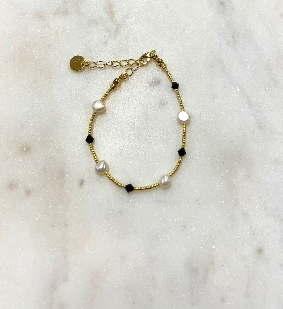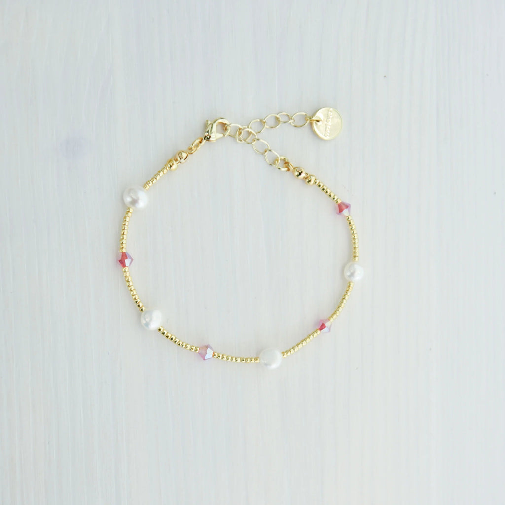 Liz armbåndet er laget med glassperler, ferskvannsperler og 18k gullbelagt messing med e-coating. Med sin justerbare størrelse kan det komfortabelt passe håndledd fra 15,5 til 18,5 cm. Det er det perfekte tilbehøret for å heve ethvert antrekk. Hvert smykke kommer i en fin smykkepose sammen med et feel good-kort, og er klar til å bli foræret.