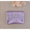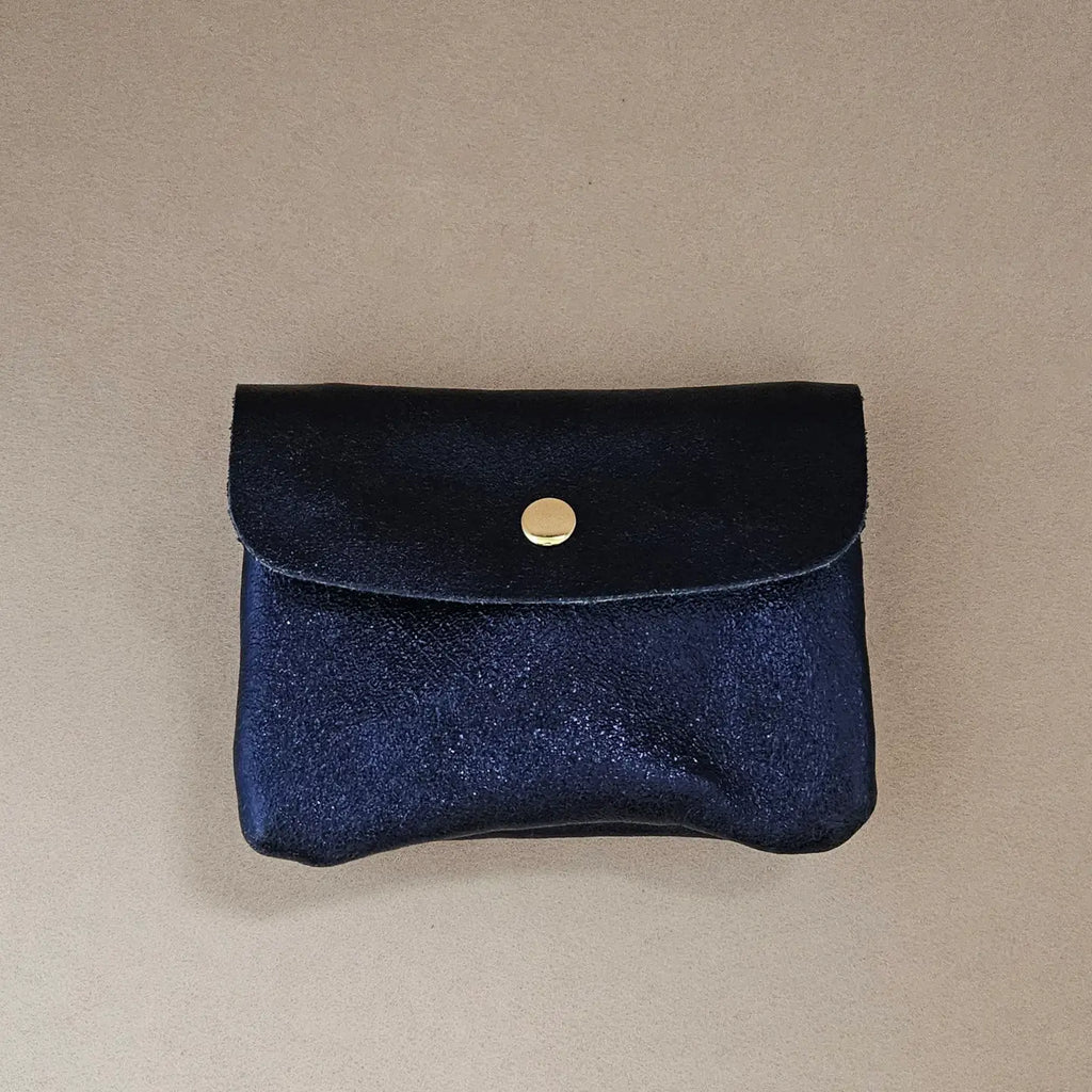 Praktisk lommebok i metallisk, ekte skinn med ett rom, én glidelåslomme og én kortlomme. Lukkes med en gyllen knapp.