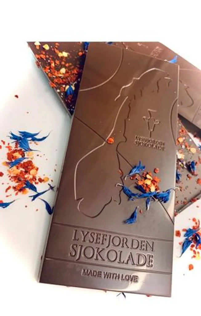 *54% sjokolade med tørket chili og litt kornblomst plukket og tørket i gloppen.