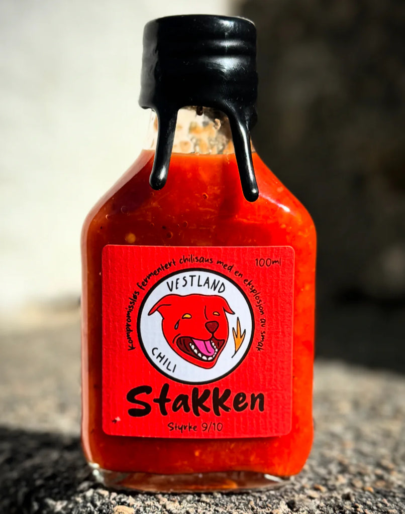 Du trenger ikke mye av Stakken-sausen for å kjenne den brenne i halsen! Stakken sausen har en styrke på 9/10.