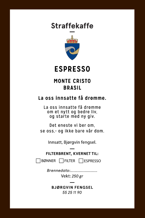 Straffekaffe er Kriminalomsorgens egen kaffemerkevare. Kaffen du kjøper er brent, kvernet og pakket av innsatte i samarbeid med ansatte i Bjørgvin fengsel rett utenfor Bergen. Vi vet at straffekaffeprosjektet kan forebygge ny kriminalitet fordi det aktivt trener ferdigheter som reduserer sannsynligheten for tilbakefall. Det gir den domfelte ferdigheter som gir mulighet til jobb.