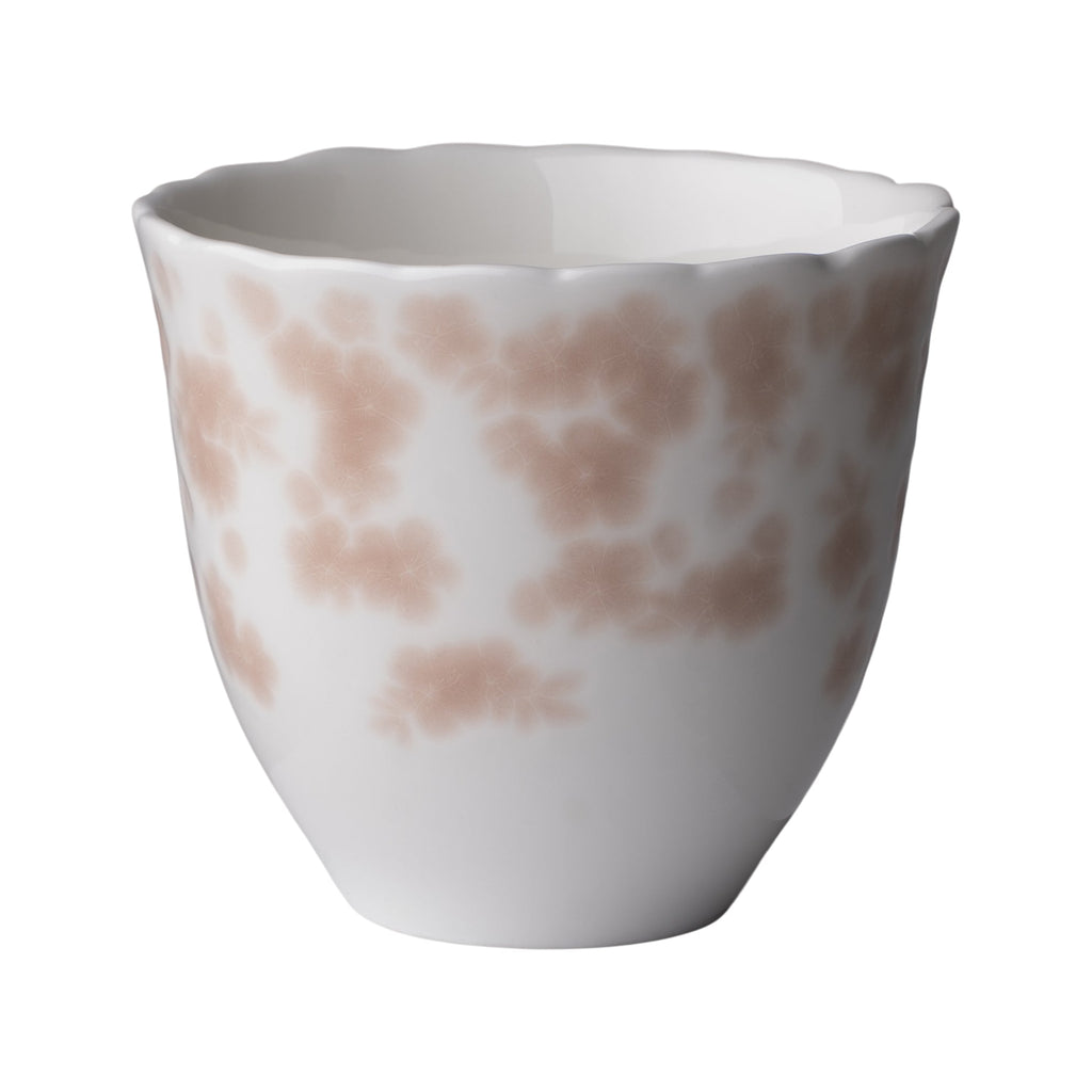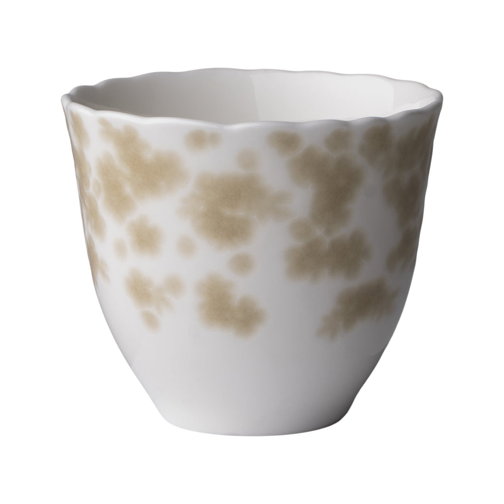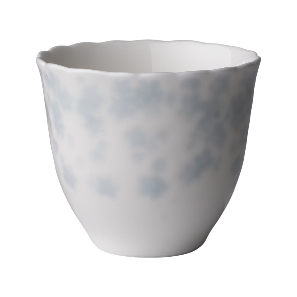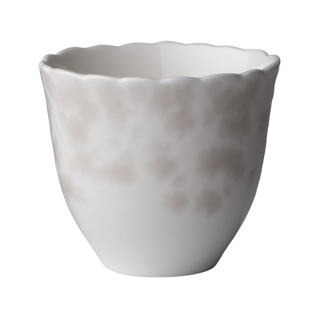 Slåpeblom kopp uten hank i edelt benporselen av høy kvalitet. Slåpeblom kjennetegnes ved den ujevne og bølgete kanten som fremhever følelsen av håndverk. Koppens runde form gjør at den ligger godt i håndflaten, skapt for å gi en lun og behagelig varme. Koppen kan stables og høyden er tilpasset de fleste typer kaffemaskiner. Med koppen i hendene kan man kjenne det taktile mønsteret som pryder det vakre designet.