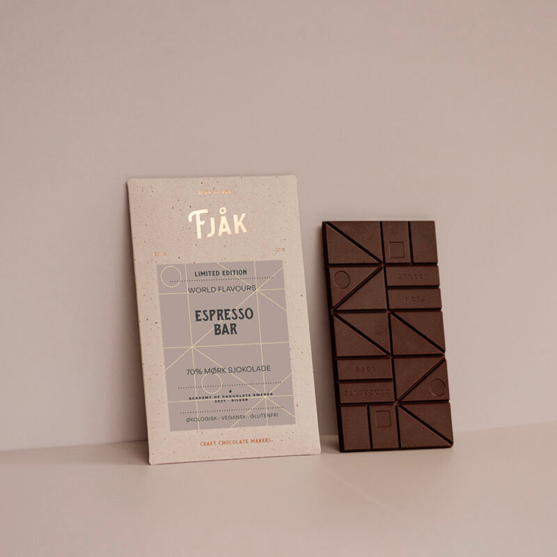 I denne sjokoladen har Fjåk blandet Monte Verde Amazonas-kaffe fra Peru med deres 70% mørke Haiti-sjokolade for å lage en sjokolade som smaker som en intens espresso.