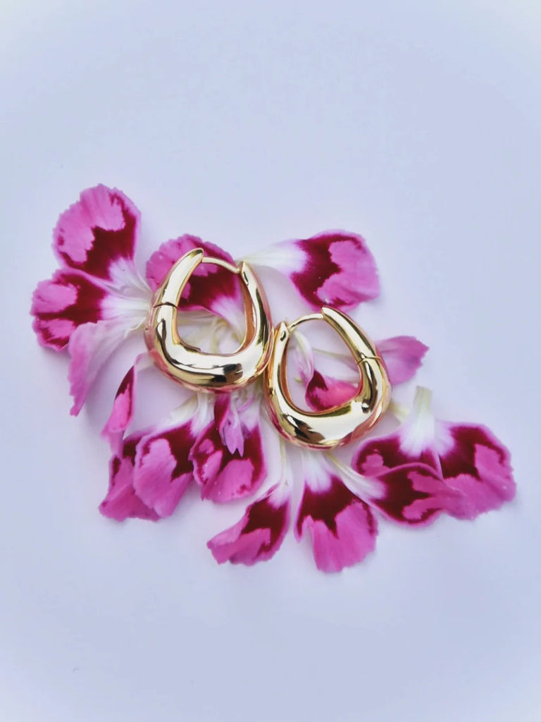 Disse øreringene i 18 karat gullforgylt messing har en myk, bølgeinspirert form som gir smykket et organisk og kraftfullt uttrykk. Den blanke overflaten fanger lyset og gir ørepynten et eksklusivt preg – perfekt både til hverdags og fest.
