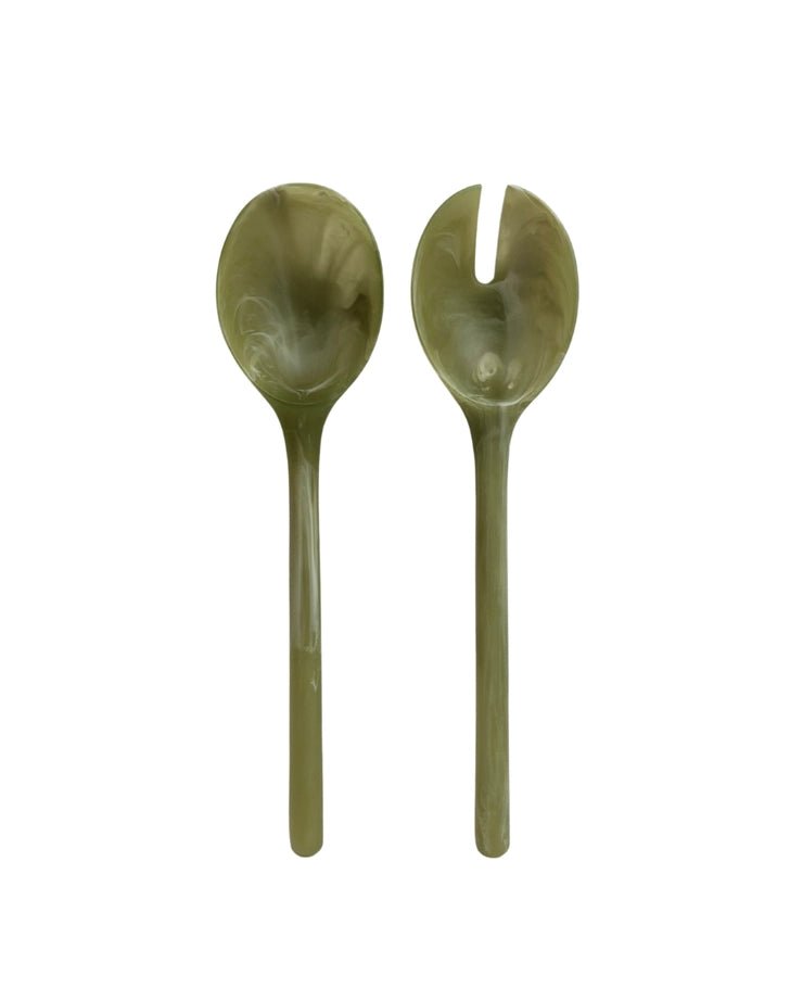 Dette salat-serviset er håndlaget med omhu, og hver del har et unikt virvelmønster. Settet inkluderer en gaffel og skje, perfekt designet for å servere salater med letthet. Salat-serviset er laget av