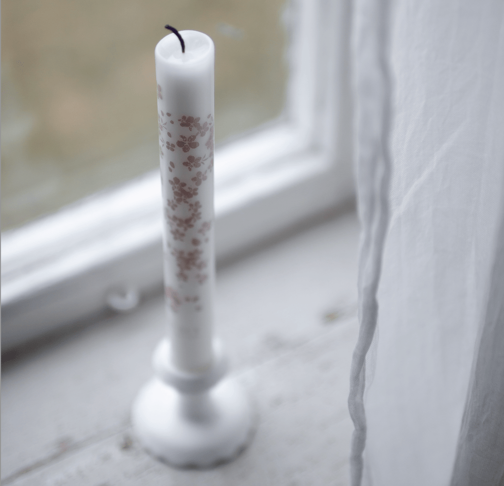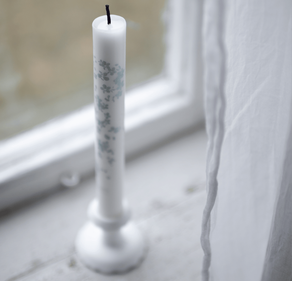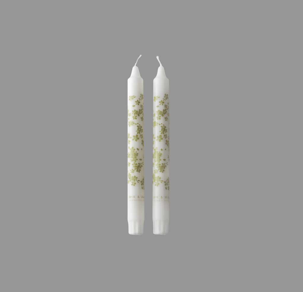 Stearinlys fra kolleksjonen "Slåpeblom". Slåpeblom er et symbol for det som går i arv og er formgitt av Wik & Walsøes grunnlegger, Linda Svedal Walsøe, i samarbeid med datteren Ylva Svedal Jørundland for hverdagene nå, og de hverdagene som kommer etter oss.