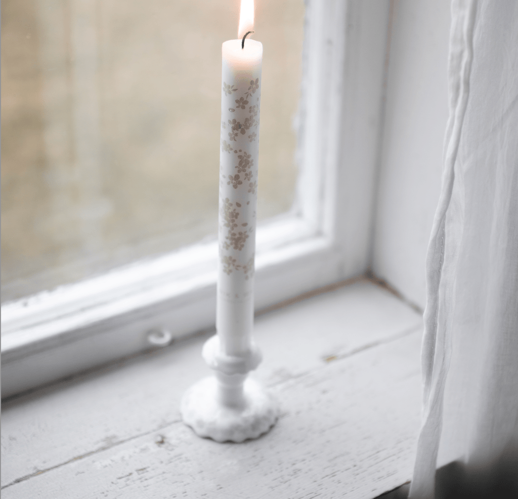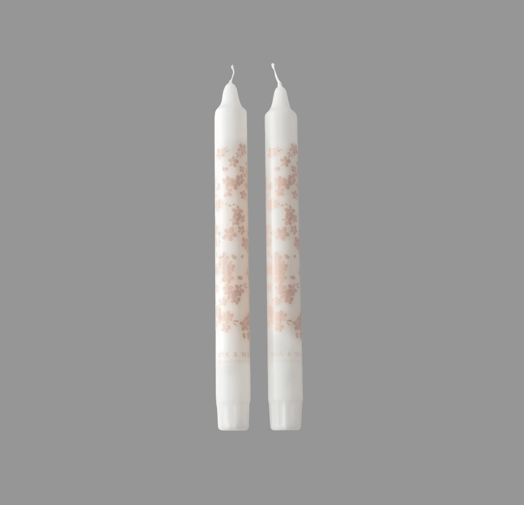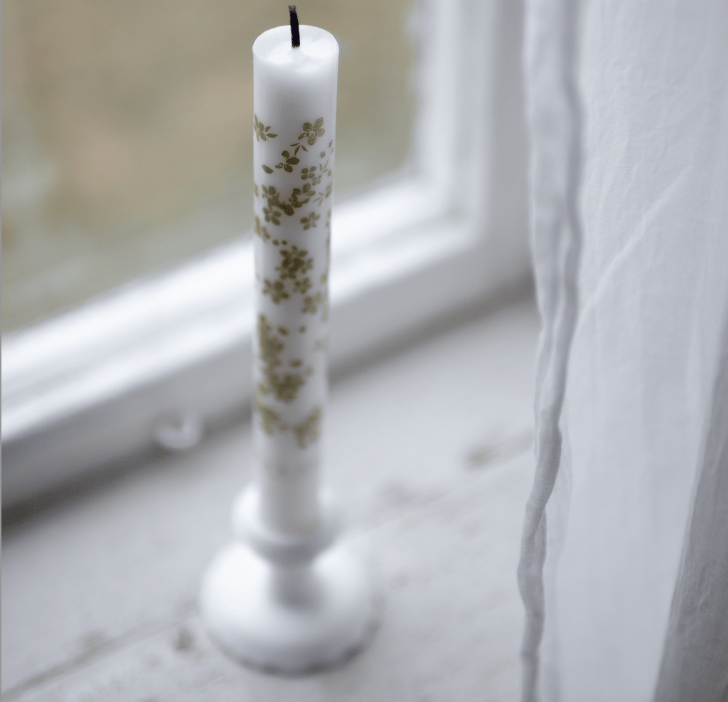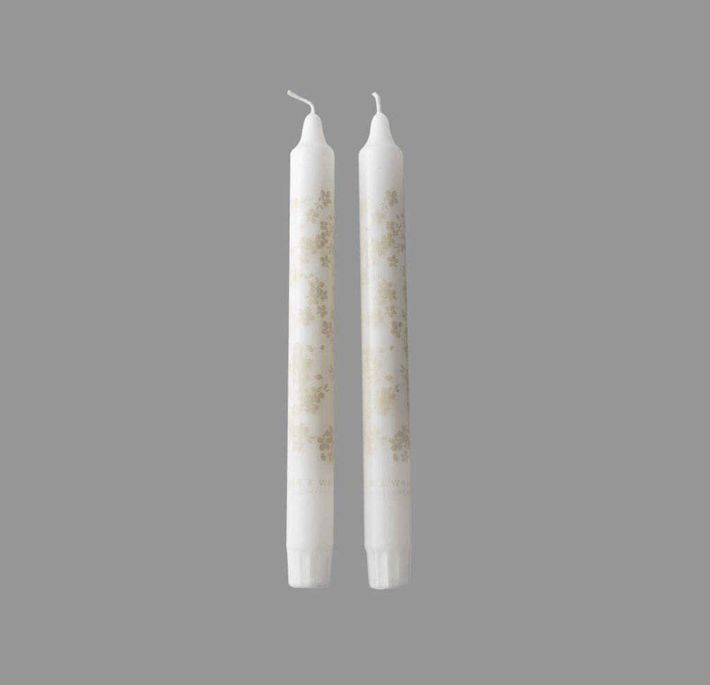 Stearinlys fra kolleksjonen "Slåpeblom". Slåpeblom er et symbol for det som går i arv og er formgitt av Wik & Walsøes grunnlegger, Linda Svedal Walsøe, i samarbeid med datteren Ylva Svedal Jørundland for hverdagene nå, og de hverdagene som kommer etter oss.